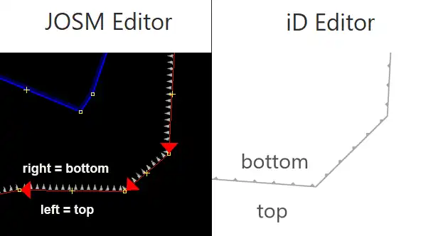 Renderers and editors might indicate the lower side of the retaining wall (the right side of the OSM way) with small triangles pointing downwards.