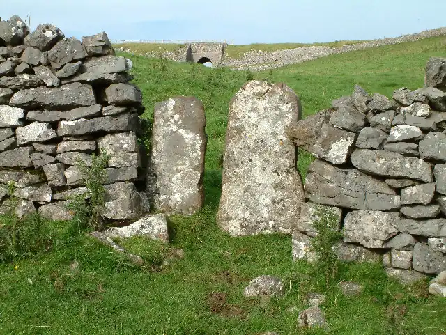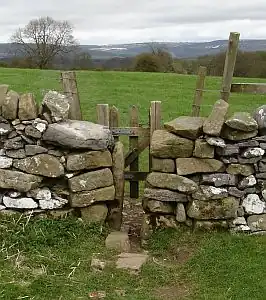 Here there is a stone squeezer type stile. The landowner has more recently added a wooden gate. This is generally done because the barrier needs to retain smaller animals.