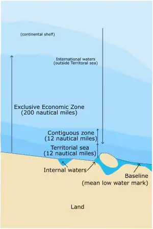 | Maritime boundaries under the UN Convention on the Law of the Sea which are not administrative boundaries: the baseline, contiguous zone, and EEZ. |