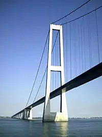 In bridge construction, a pylon is the towering component over which the suspension ropes run or on which the stay cables of stay cable bridges are anchored.