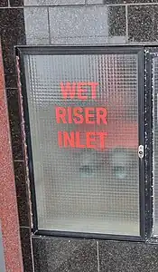 A Wet Riser Inlet or Charged Riser[1] is similar to a Dry Riser, except that the pipes are permanently filled with water from a tank in the building or the city's water mains. The inlet allows the fire brigade to pump water into the system to supplement the normal water supply.[2][3]