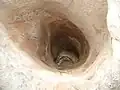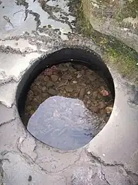 | A regular hole in a rock created by the rotation of stones in the bed of a stream. |