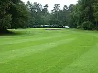 | Fairway of a golf course: an area between the tee box and the putting green where the grass is cut even and short. |