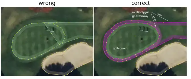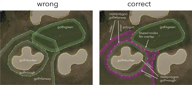 - Overlapping green/fairway/rough polygons (see graphics below). If there is no fringe, or the imagery isn't clear enough to say one way or another, butt the fairway and green together and share nodes. If there is a clear "fringe" around the green, the fairway should extend around the green and be combined with the green into a multipolygon.