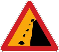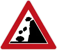 A falling rocks hazard is an area in which rocks, dirt, or other natural materials may fall unexpectedly from cliffs above, or may have fallen, presenting a hazard. May be combined with natural=scree for areas in which rubble from prior falls has collected.