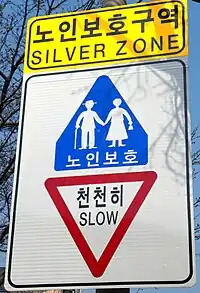 A silver zone is an area with special traffic laws for the safe passage of elderly or those with limited mobility. Signs remind drivers to slow down, obey various safety signs, and be careful not to impede the passage of elderly or those with limited mobility.