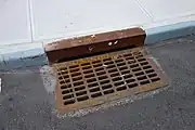 | A storm drain gutter inlet covered by a horizontal grate, attached to a section of kerb, to catch storm water while retaining debris. |