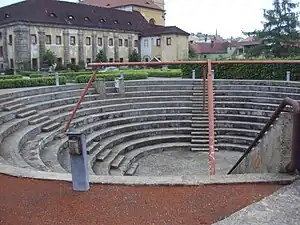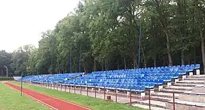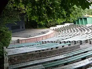 | Raised, tiered rows of benches found at spectator events. |