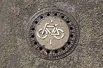 A drain located in the street in Germany. Also with only small perforations. The bicycle emblem may signify that this style of drain is designed to be more bicycle friendly, lacking the "large slot" style that can catch thinner bicycle tires. |