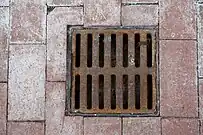 A "grate" style drain, with thin bars and square shape. |