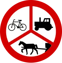 (cars needs to be constructed to be able to drive at 80 km/h or faster on a flat road, actually there is no minimum driving speed)[7]minspeed=80foot=no(implied by motor_vehicle)bicycle=no(implied by motor_vehicle)moped=nohorse=no(implied by motor_vehicle) (and more generallyanimal=no)agricultural=no- no access to motorcycles equipped with a thermal engine having a displacement smaller than 150 cm³ (