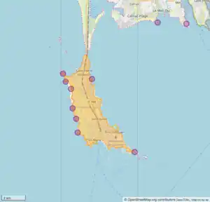 The tag natural=peninsula is used to tag a named peninsula (from Latin paeninsula, from paene "almost" + insula "island"): a piece of land projecting into water from a larger land mass and being nearly surrounded by water.