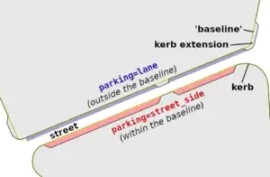 • Kerbs form a line that separates the carriageway from the roadside space. Kerb extensions and the parking area in between usually extend out from this "baseline", while street-side parking areas fall behind this "baseline" (see illustration on the right).