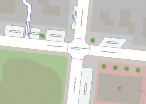 • Same as with parking=surface, separate parking places can be drawn in and tagged with amenity=parking_space, but this is optional (Note: Do not use parking=street_side on these parking spaces if they are already part of a larger area with this tag).