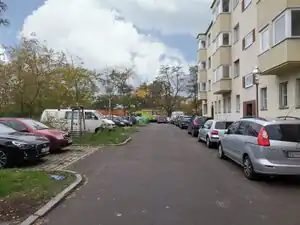 The parking area is indicated by installations on the roadway (e.g. bollards), which could, however, be removed without major reconstruction efforts in order to restore the roadway.