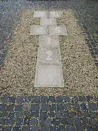 Use the tag playground=hopscotch on a node or draw as an area along the structure outline. Alternatively, draw a line along the jump path.