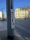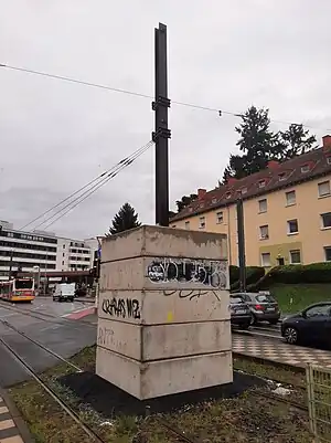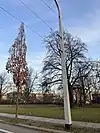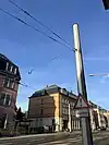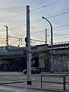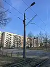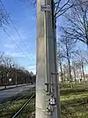 | A pole supporting the overhead wires used to supply electricity to vehicles equipped with a pantograph such as trams and trains. |