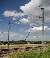 The overhead contact line does not consist of a single contact wire that runs from the start to the end of the line, but is divided into sections that are up to approx. 1.5 kilometres long. This is for static reasons, as the overhead contact line should always have the same tension, but the length of the overhead contact line (material: copper) changes with the temperature. In addition to their function of holding the overhead contact line, some catenary masts have additional tasks. Some have the task of tensioning a overhead contact line section that is coming to an end. There are different ways of maintaining tension as seen in the table.