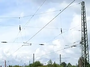 overhead wires used to supply electricity to electrically powered vehicles equipped with a pantograph, such as trams, streetcars, light rail, and trains.
