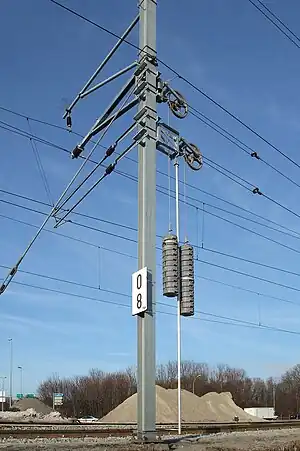 Catenary masts are also used to attach switches for supply lines, couplings or similar items. As well, insulators between catenary and mast are used to separate the potentials. These are usually made of the same material within a catenary mast.