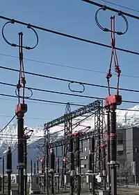 63 kV busbar switches connecting a power line (going from left to right) to substation busbars (on top).