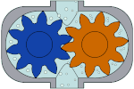 | A positive displacement pump involving rotating gear wheels to carry a fluid to pump discharge |