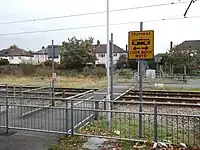 Tram crossing - a point where a footway crosses a tramway on the same level. Sometimes equipped with traffic signals or warning lights and/or acoustic warning.