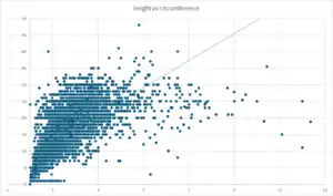 - the average height/circumference ratio is 15.07 (minimum: 0.03, maximum: 2400), based on 5879 trees.