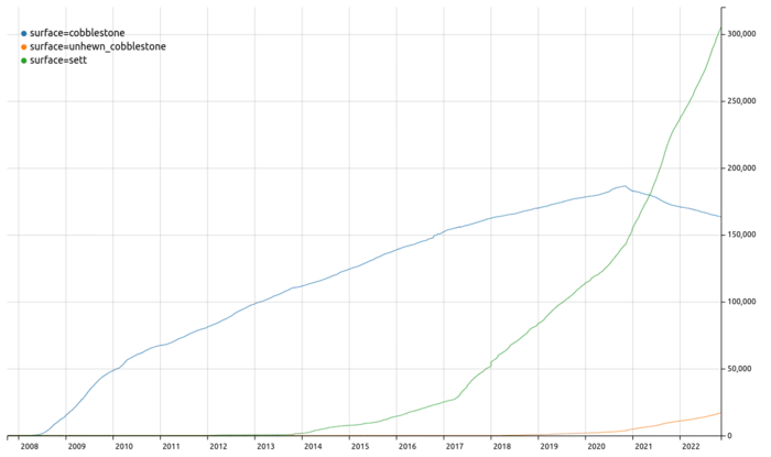 surface=cobblestone decrease since that time is driven in large part by StreetComplete treating it as surface that needs resurvey (and asking user to specify it and giving surface=unhewn_cobblestone and surface=sett among options).