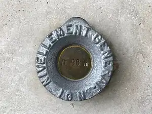 Use survey_point:structure=medallion for a circular plate embedded at the surface of a larger structure, typically a building. Many of the benchmarks placed in the United States fall under this description. (See Examples) Survey instruments may be inserted in it for measures.