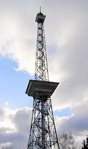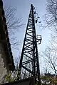 The tower is constructed of a latticework, consisting of a criss-crossed pattern of strips of building material.