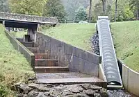 An artificial structure channeling water released from a water body, either under controlled circumstances or as a means of ensuring that water levels do not overflow and destroy containing structures (dams, levees). Spillways will normally be free of water but remain dangerous since water can be expected at any time.