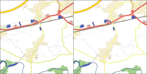 The tracktypes are currently coded in the border of the ways. This is visible on land hardly distinguishable in forests: [2]. Maybe base color or thickness is a better way to show the tracktype? --Coomba 19:51, 18 June 2008 (UTC)