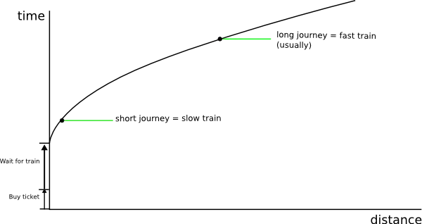 One other approximation might be to assume that average speed is higher the further you travel on one train, e.g.: