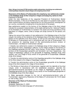- Постановление Меджлиса Милли Генгеша Туркменистана об отнесении к категории города нового современного административного центра Ахалского велаята и присвоении ему наименования 20 December 2022