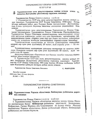 | Source: Turkmenistan Supreme Soviet Resolution No. 686-XII of 17 April 1992 | ||
