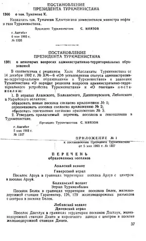 - ↑ This town is not included in the list Districts in Turkmenistan but its renaming and upgrade to town status are attested in a parliamentary decree of 25 November 2017: Внесены изменения в административно-территориальное деление Лебапского велаята.