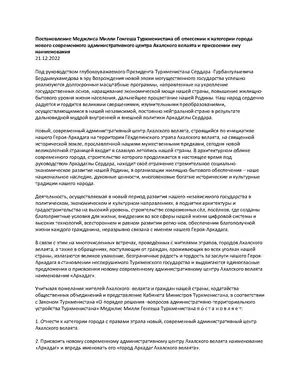 - ↑ “Постановление Меджлиса Милли Генгеша Туркменистана об отнесении к категории города нового современного административного центра Ахалского велаята и присвоении ему наименования” (in ru). Электронная газета «Золотой век». 21 December 2022.