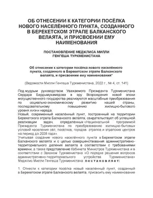 - ↑ “Balkan welaýatynyň Bereket etrabynda döredilen täze ilatly ýere şäherçe derejesini bermek we oňa at dakmak hakynda”. Milli Geňeş. 10 December 2022.