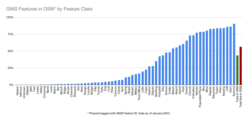 The initial imports of GNIS were in 2009. At this time, selected GNIS records in certain feature classes were imported into OSM and tagged as OSM features. However, the imports only covered a subset of GNIS data. In some feature classes (such as the Summit class), the majority of GNIS records were imported into OSM. In other feature classes, few or no GNIS records were imported. The bar chart below shows the observable progress in importing GNIS records as of January 2023.
