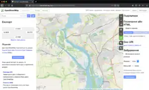 Панель Поділитися дозволяє отримати частину мапи у вигляді зображення PNG, JPEG, SVG або PDF у вигляді Стандартного шару OpenStreetMap (типовий шар на головній сторінці), який генерується з допомогою рендера Mapnik.