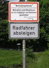 У тому ж сенсі деякі мапери використовують відмінність між no та dismount, щоб показати, чи "рекомендується" злізти з велосипеда та вести його поруч (або безпосередньо за знаками, або коли ділянка, де ви повинні спішитись, знаходиться на позначеному велосипедному маршруті).