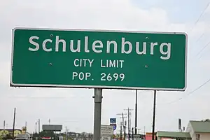 A sign marking a municipality boundary, Schulenburg's city limit, Texas
