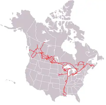 Created by a 2023 merger between CP and KS. Along with its México subsidiary KCSM, CPKC is the first (and only) tri-national railroad in North America. CPKC's network includes ~20,350 miles of track in total, including ~8,600 miles in the USA.