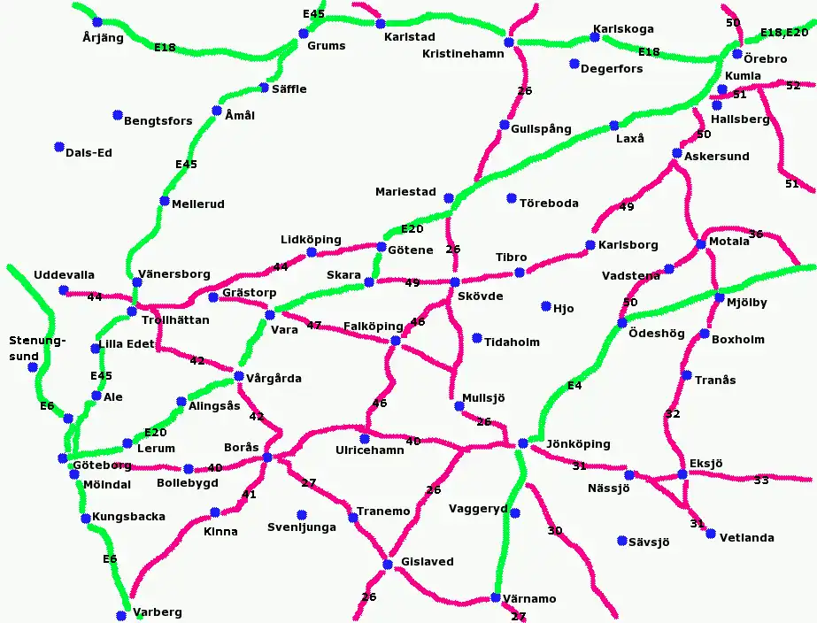 Outline of the major roads and cities of the province Västergötland (and Dalsland, Bohuslän, Halland, Närke, Småland, Värmland, Östergätland) in Sweden, see current map]]