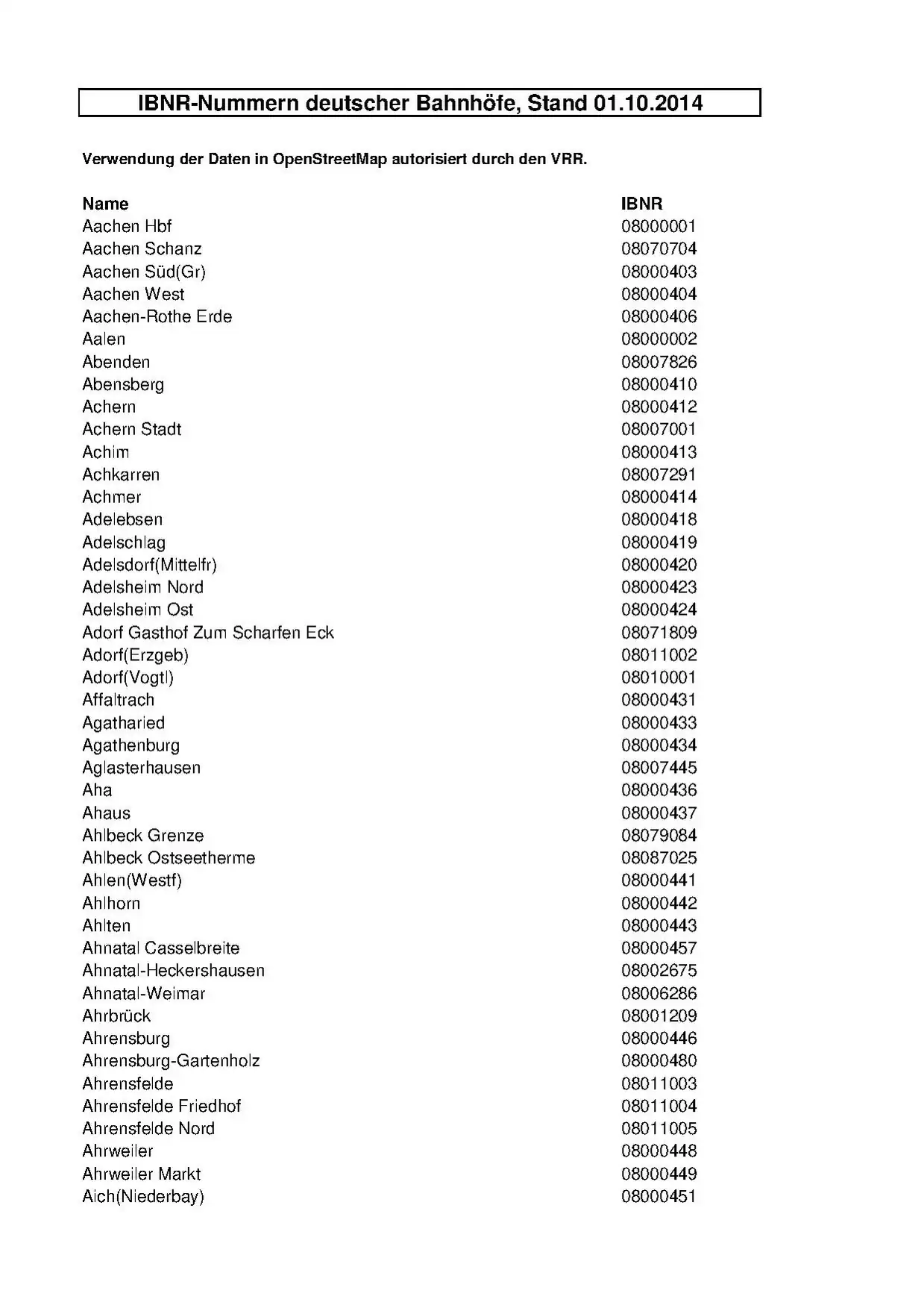 • Datei mit allen IBNR-Nummern deutscher Bahnhöfe, Stand 10/2014, Verwendung für OSM autorisiert vom VRR. Bitte beachten: Der VRR selbst nutzt zur eindeutigen Referenzierung all seiner Haltestellen die weltweit standardisierte IFOPT-Nr. (s. oben). Die als "uic_ref" zu taggende IBNR ist ein per Definition nur für Bahnhöfe geltender Standard, auch wenn im HAFAS-Auskunftssystem der DB auch "normale" Haltestellen über eine Nummer verfügen. Da es sich hier für "nicht Bahnhöfe" um ein proprietäre Numerierung in der HAFAS-Auskunft handelt, ist die Notwendigkeit einer Erfassung in OSM zu hinterfragen.