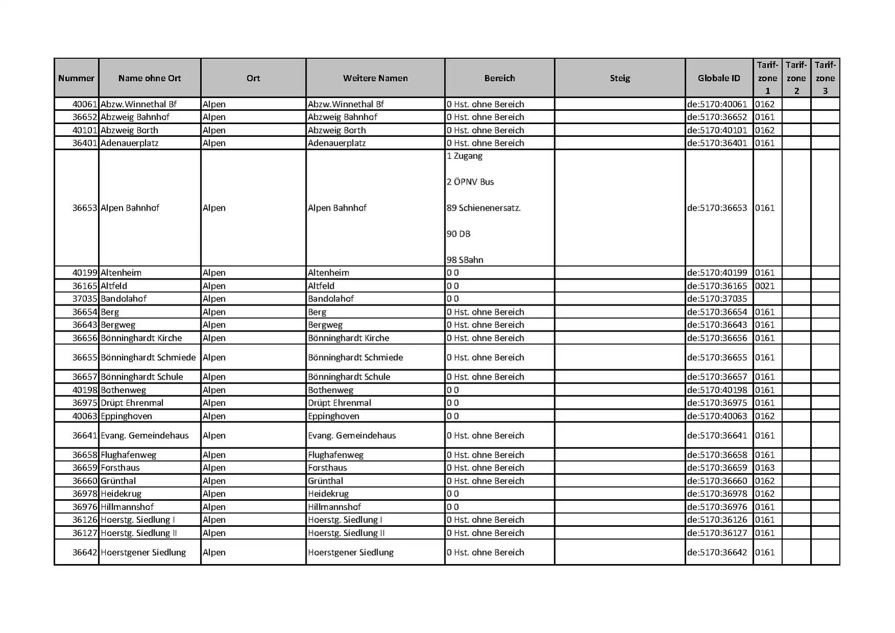 Anmerkungen VRR (User: VRR): Eine Liste mit allen Haltestellen im VRR und in den Randgebieten des VRR, in denen der VRR-Tarif gilt, wurde erstellt. Diese enthält über 13.500 Haltestellen mit Bereichen, Steigen und Tarifzonen. Wenn gewünscht kann die "uic_ref" bei Bahnhaltestellen ebenfalls ausgewiesen werden.