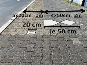 width=*: Gehwegbreite (möglichst vor Ort messen oder anhand der Breite von Gehwegsteinen abschätzen: siehe Abbildung). Gemeint ist die nutzbare Breite des Gehweges, also abzüglich von Randstreifen und anderen Bereichen, die durch Straßenlaternen, Baumscheiben oder sonstige Straßenmöbel, Gehwegeinbauten und Objekte keine durchgehende Nutzung zulassen. Ist die Breite des Weges bzw. Wegesegments nur an einer Stelle eingeschränkt – z.B. neben einem alleinstehenden Baum, Stromkasten, Außengastronomie o.ä., oder auch durch Poller (barrier=bollard) – kann die abweichende Breite durch einen Punkt mitmaxwidth:physical=*angegeben werden.surface=*: Belag des Weges – bei Querungen der Belag im Bereich der Querung bzw. kreuzenden Fahrbahn (bei abwechselnden Belägen der qualitativ schlechteste)smoothness=*: Oberflächenqualität/Ebenheit des Wegeslit=*: Beleuchtung bei Dunkelheit