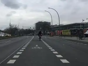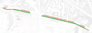 Die nach Norden führenden Radstreifen sind als separate Linien gemappt, da es sich dabei um geschütze Radstreifen handelt, die mit Leitschwellen und im späteren Verlauf einem Parkstreifen physisch vom fließenden Verkehr separiert sind (vgl. cycleway:separation). |