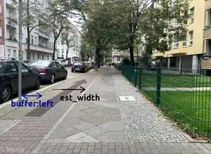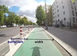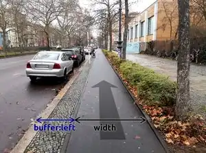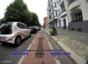 buffer:right ist insbesondere als Schutzabstand links neben parkenden Autos (Gefahr durch sich öffnende Autotüren) oder in Gehwegnähe neben dem Fußverkehr interessant. buffer:left ist insbesondere bei geschützten Radfahrstreifen eine wertvolle Zusatzinformation, um den Sicherheitsabstand zum motorisierten Verkehr zu evaluieren. |